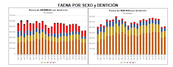 La evolución de la faena de Machos ha seguido el camino inverso, con una fuerte presencia de animales con hasta 4D, que se acentuó en febrero, y con una mayor participación de los más jóvenes (Hasta 2D).