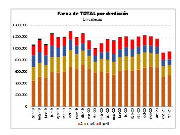 Durante abril y mayo, la composición de la faena acusó un aumento en el número y en la participación de Hembras dentro del total sacrificado, llegando a representar el 50% del total. A partir de entonces, esta tendencia se revirtió registrándose en diciembre la más baja de todo 2020. Pero hubo un leve repunte en el inicio de 2021, llegando al 45.6% durante el mes analizado debiéndose resaltar que fue el resultado de un incremento relativo de las más añosas.
