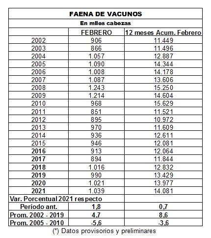 “La faena registrada en el febrero de 2021 fue 2% mayor a la de doce meses atrás y comparado con el promedio 2005 – 2010 estuvo un 6% por debajo. En los últimos doce meses, se han sacrificado 14 millones de cabezas, 9% más que la media registrada entre 2002 – 2020” destacó Ravettino.