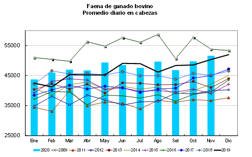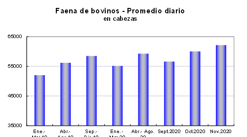 Buenos Aires, 3 de diciembre. De acuerdo datos proporcionados por la Dirección Nacional de Control Comercial Agropecuario (DNCCA), en noviembre de 2020 la faena de bovinos fue de 1.24 millones de cabezas, 1,4% menor a la del mes anterior. En los primeros once meses de este año, se alcanzaron poco más de 13 millones de bovinos, 3% superior al acumulado en igual lapso del año pasado. Pese a la aparente caída respecto de octubre último, cuando se considera que tuvo menor cantidad de días hábiles, resulta que alcanzó el nivel más elevado de 2020 y uno de los mayores de los últimos años.