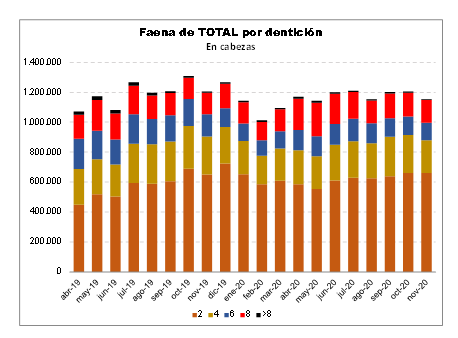 TOTAL: hubo un incremento relativo en el número de animales tipificados en los dos extremos: con 2 y 4 dientes y de 8 y más dientes – factor en el que primó la evolución de la faena de hembras – , con una reducción relativa de las tipificaciones intermedias: mientras que en 2019, el 70% del total de animales tipificados tenía hasta 4 D, a noviembre último, esta proporción pasó a ser del 74%.