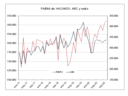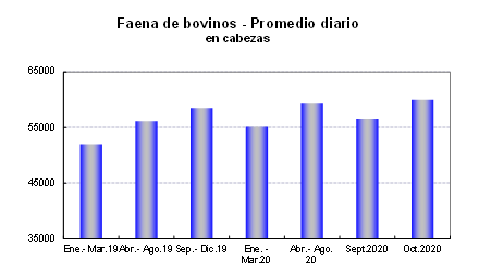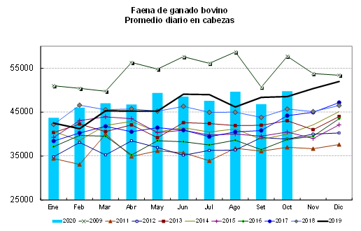 Al relacionar el total sacrificado en octubre con la cantidad de días hábiles, se advierte que superó a mayo último y que es el más elevado desde 2009, compensando la retracción que se verificó en septiembre. Después de la caída registrada en el primer trimestre de este año, la faena se ha mantenido firme y por encima del año pasado. Considerando el promedio diario de los últimos diez meses, hubo un aumento del 5% comparado con igual lapso del año pasado.