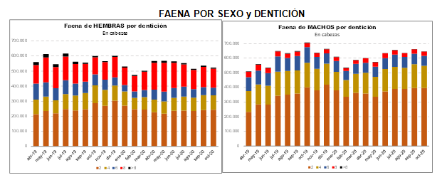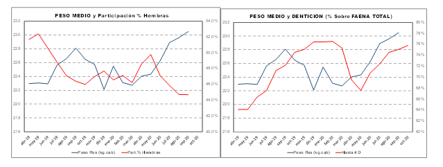 Hembras: En 2020, como se mencionó, se observa un cambio de tendencia en la faena. Al analizar la clasificación por dentición, se verifica que la reducción en su número total fue acompañada por una baja más acentuada en vacas, especialmente aquellas tipificadas con 8 y más de 8 dientes, con una mayor incidencia de vaquillonas. No obstante, su proporción es superior a lo que se verificó en 2019. En los primeros nueve meses de 2020 el peso medio de las hembras sacrificadas fue de 208 kg por cabeza.