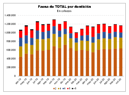 TOTAL: hubo un incremento relativo en el número de animales tipificados en los dos extremos: con 2 y 4 dientes y de 8 y más dientes – factor en el que primó la evolución de la faena de hembras – , con una reducción relativa de las tipificaciones intermedias: mientras que en 2019 el 70% del total de animales tipificados tenía hasta 4 D, a octubre último, esta proporción pasó a ser del 73%.