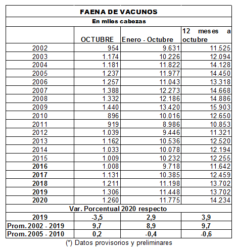 La faena registrada en octubre de este año estuvo por debajo de igual mes de 2019, aunque debe destacarse que en esa oportunidad hubo dos días hábiles menos. El total sacrificado superó en un 10% al promedio 2002-2019 y fue similar al quinquenio 2005-2010. El acumulado en el ciclo 2019/20, cerrado en el mes de octubre con un total de 14.2 millones de cabezas, equipara a la media de los años 2005-2010.