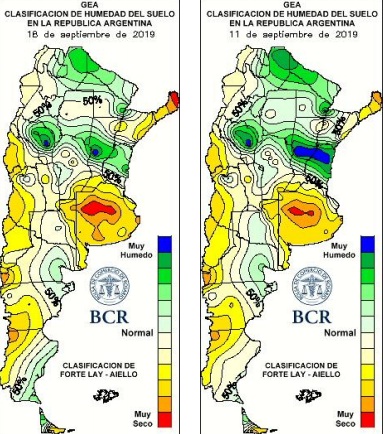 Faltan más milímetros que en el 2018. Comparando la reserva de agua en los suelos de esta semana con la de un año atrás, la falta de agua es más pronunciada y la sequía cubre una mayor área. Hoy, para alcanzar un nivel óptimo de humedad del suelo se necesitarían lluvias de 120 mm en Córdoba, y entre 60 y 80 mm en el sur de Santa Fe. Son 20 a 40 mm más de lo que señalaban los modelos para la misma época del 2018.