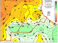 Mientras que en la campaña pasada la región núcleo contaba con óptimas condiciones de humedad para la siembra -incluso con algunos excesos puntuales-, este año la siembra se frena por déficit hídrico. El este cordobés cuenta con casi un 20% menos de reservas hídricas para continuar con el avance de las sembradoras. Las semillas de trigo no encontrarían condiciones propicias para emerger. Sin embargo, las capas profundas del perfil del suelo cuentan con una buena recarga. El centro sur de Santa Fe presenta un foco de déficit hídrico en torno a la localidad de Álvarez. En contraste, la franja sur de Santa Fe limitando con la provincia de Buenos Aires es favorecida con 10% más de humedad, mientras que hace un año atrás esta zona presentaba los valores humedad en amarillo.