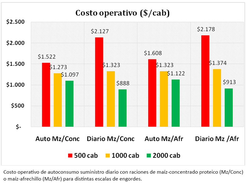 Los costos operativos fueron estimados para escalas de 500 a 2.000 cabezas/año, considerando la diferencia en el tiempo efectivo de trabajo del personal entre los métodos de ofrecimiento. En el caso del autoconsumo se tuvo en cuenta el suministro semanal más la observación diaria de los comederos.