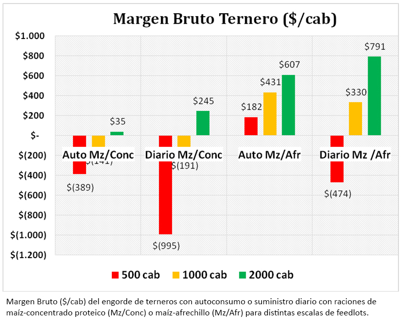 En escalas mayores a 1.000 cabezas, los resultados son positivos en los sistemas que utilizan maíz-afrechillo y negativos en los de maíz-concentrado proteico, independientemente del método de suministro. Los márgenes más bajos se obtienen con el sistema maíz-concentrado, siendo peor si es suministrado en autoconsumo.