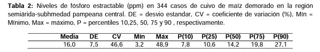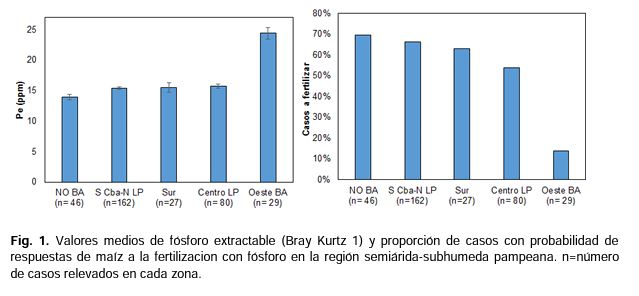 En la región, los mayores valores medios se observaron en Oeste de Buenos Aires y centro de La Pampa y los menores en la zona noroeste de Buenos Aires (Fig.1). Considerando 16 ppm de Pe como el nivel crítico indicador de mayor frecuencia de respuestas a la fertilización de maíz, la mayor proporción de casos con necesidades de fertilización se observó en NO Buenos aires y S Cba-NE de la Pampa, mientras que en Oeste de Buenos Aires fue menos frecuente.