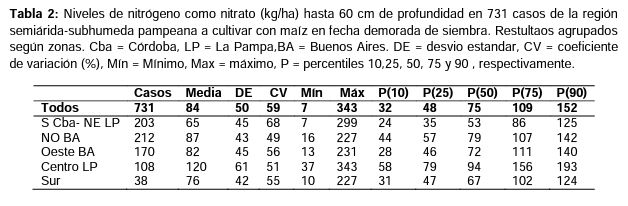 La disponibilidad de N-NO3 en los 60 cm superficiales de 731 casos de producción de maíz demorado en la región semiárida-subhúmeda pampeana varió entre 7 y 343 kg/ha. Estos valores mostraron, en todas las zonas consideradas, alta variabilidad reflejada por coeficientes de variación próximos y superiores al 50% (Tabla 2). Entre varios factores, no contempladas en este estudio, la variabilidad dependió de factores edáficos de los sitios (textura, materia orgánica, humedad) en interacción con su manejo (años en agricultura continua a partir de pasturas, labranzas). Tal lo observado en el caso de los niveles de Pe, en todas las zonas, la cantidad media de nitrógeno fue mayor al valor de la mediana. Esta diferencia se atribuye a la presencia, poco frecuente de casos con muy altos contenidos de nitrógeno. La zona de menor disponibilidad media es el Sur de Cba- NE de la Pampa y la Zona Sur. En su mayoría en estas zonas predominan suelos de textura más arenosas que podría condicionar la mineralización de este nutriente. Es de destacar que un 25 % de los lotes presentan contenidos por debajo de 50 kg/ha lo que en general resultan bajos para el período en que se realizaron los muestreos. Los mayores valores medios de N se observaron en el área central de La Pampa atendiendo a la distribución desuniforme de casos con registros superiores a los 120 kg/ha (Fig.2). Parte de este comportamiento puede atribuirse a la menor frecuencia de cultivos de cosecha instalados en la última campaña antes restricciones hídricas severas durante el verano y consecuente mayor duración de barbechos.