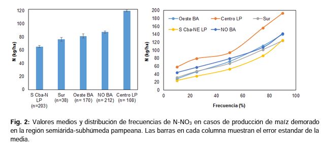 En la campaña agrícola 2021/22, los registros de indicadores del estado de fertilidad de suelos en la región semiárida-suhbhuemda pampeana para maíz en fecha demorada de siembra validan la alta frecuencia de casos con restricciones de fósforo y de nitrógeno para el normal crecimiento y producción del cultivo. Para el diagnostico de ambos elementos nutrientes es recomendables implementar estrategias de muestreo ambientadas e inteligentes tal de limitar la inclusión de casos fuera de tipo que conducen a la sobreestimacion en los valores medios de referencia. Entre el 50 y el 75% de los casos presentaron valores de Pe que sugieren la conveniencia de fertilización con fósforo. En el caso de la oferta de nitrógeno, en casi la totalidad de los casos los niveles son insuficientes para alcanzar la productividad media de maíz en la región y requieren de la aplicación de fertilizantes. Estos resultados variaron, entre otros factores entre zonas y según cultivos previos. Los mayores contenidos se observaron en secuencias con leguminosas (soja, pasturas, maní) y con barbechos invernales. Para el manejo eficiente de la nutrición con nitrogeno, además del diagnóstico ambientado de suelos para su análisis es importante sincronizar la incorporación efectiva del fertilizante en la solución del suelo anticipando la demanda del cultivo.