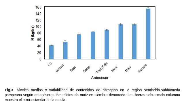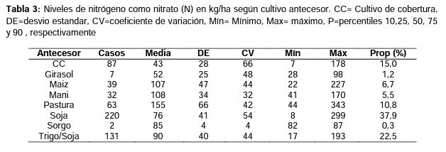 En cuanto al cultivo antecesor se observa una mayor participación de soja de primera (38%) y de segunda sobre trigo (23%), seguida por cultivos de cobertura (CC, 15%), en su mayoría de vicia o vicia en mezcla con gramíneas (Tabla 3 y Fig. 3). También se destaca casi un 11 % de lotes que proviene de pastura. En general, se observa una menor disponibilidad y menor variabilidad de los valores de N sobre CC, que podría estar relacionado con los pocos dìas transcurridos entre la finalización de su ciclo y el monitoreo de N en los suelos, o por una mayor inmovilización de N en aquellos casos de alta participación de gramínea con una relación C/N mayor en los residuos. Los mayores contenidos de N disponbiles se observan sobre antecesor pasturas, mani y maíz. Estos resultados son orientativos dado que la participación relativa de estos cultivos es inferior que los casos con antecesor soja y su distribución entre zonas también es más dispersa.