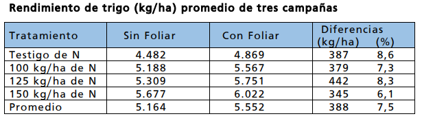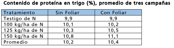 Además de lo descripto, se establecieron tratamientos gemelos a los anteriores, con la diferencia que a estos últimos se los complementó con una fertilización foliar entre fin de macollaje y primer nudo con 10 l/ha de Nitroplus 18. Este es un fertilizante líquido que contiene 18 % de nitrógeno y 7 % de calcio. En todos los años la cosecha fue realizada en forma mecánica, determinándose el rendimiento y corrigiendo el mismo a humedad de recibo, también se determinó para cada unidad experimental y año el contenido de proteína. En la siguiente tabla se presenta el resultado promedio de las tres campañas.