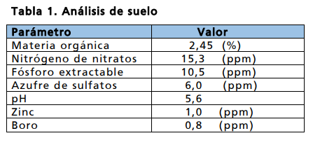 En base a lo comentado hasta aquí, en la campaña 2017/18 la Agencia INTA 9 de Julio realizó una experiencia en un campo típico de la zona . El objetivo fue probar la complementación de la fertilización tradicional que realizaba el productor, con otros productos que podrían contribuir a mejorar la producción del cultivo de soja. La experiencia se condujo en el campo que trabajan los Hnos Massaccesi en las proximidades de Mulcahy, partido de 9 de Julio. El suelo corresponde a un hapludol éntico, serie Norumbega. Previamente a ser sembrado se realizó un análisis del suelo hasta 20 cm de profundidad, arrojando los valores que se muestran en la Tabla 1.
