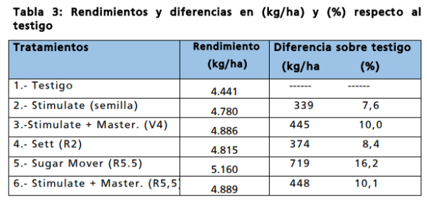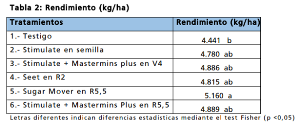 Sugar Mover: Es un fertilizante líquido que contiene 9 % de boro, 0,03 % de molibdeno y cofactores de crecimiento. Las aplicaciones foliares se realizaron con muy buenas condiciones ambientales. En todos los casos se llevó el volumen total de apli cación a 100 l/ha, con el agregado de agua. La cosecha se efectuó en forma manual (2 m2) por cada unidad experimental, el material fue posteriormente trillado en una máquina estacionaría, pesado, tomada su humedad y expresado el rendimiento 13,5 %. Tabla 2.