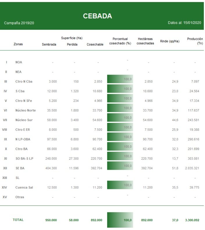 Con una producción de 3,3 MTn y un rinde medio nacional de 37 qq/Ha, se da por finalizada la recolección del cereal en las 892 mHa aptas.
