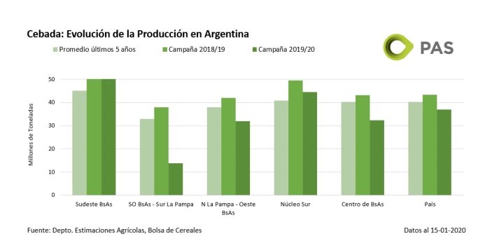 Culmina la cosecha del cereal tras la recolección de los cuadros implantados sobre el sur de Buenos Aires y La Pampa con mejoras en los rindes. Rendimientos semanales promedio de 47 qq/Ha elevan la producción nacional para la campaña 2019/2020 a 3.300.000 toneladas. Pese a esta mejora relevada en el último tramo de cosecha, la producción nacional registró una caída interanual superior al 21 % como consecuencia de la reducción del área implantada y el impacto del déficit hídrico en el núcleo productivo del Sudoeste de Buenos Aires y Sur de La Pampa (Producción 2018/19: 4,2 MTn).