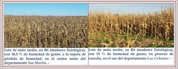 En los cultivares de maíz tardío continuó lentamente el avance del proceso de cosecha, según las zonas de los diferentes departamentos que constituyen el área de estudio. En los días donde las condiciones climáticas fueron estables y favorables, el porcentaje de humedad de grano fluctuó entre 14,5 y 18 %, situación que se modificó durante dos a tres días, ante la inestabilidad que se manifestó. El estado sanitario del cultivo fue bueno a muy bueno, sin inconvenientes hasta el momento. En los departamentos del sur, el rendimiento promedio fluctuó entre 80 a 105 qq/ha, con lotes puntuales de 115 qq/ha. En los departamentos del centro, el rendimiento promedio fluctuó entre 65 a 85 qq/ha, con lotes puntuales de 100 qq/ha. En los departamentos del norte, el rendimiento promedio fluctuó entre 40 a 60 qq/ha, con lotes puntuales de 75 qq/ha. El estado fenológico de los cultivares observado fue en R “estados reproductivos” R6 (madurez fisiológica).