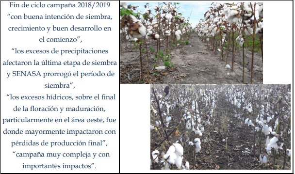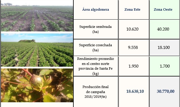 Fin de ciclo del cultivo para la campaña 2018/2019. Con una superficie sembrada de 50.820 ha, superficie cosechada 27.658 ha, con un rendimiento promedio de 1.825 kg/ha y una producción de 49.408,10 tn, en el total del área algodonera.
