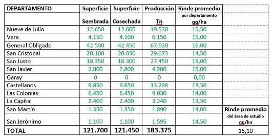 El rendimiento promedio en general, alcanzó mínimos entre 5 – 7 – 9 qq/ha, medios de 24 – 26 – 30 qq/ha, con máximos de 46 – 48 – 50 qq/ha, pero algunos maizales llegaron a los 60 qq/ha, siempre en lotes puntuales y aislado