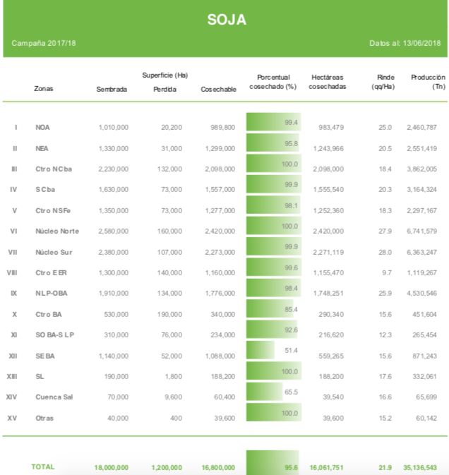 Con un 95,6 % del área cosechada, el rinde medio nacional descendió a 21,9 qq/Ha y la producción acumulada supera las 35,1 millones de toneladas. Bajo este escenario la proyección de producción al cierre del ciclo se mantiene en 36 millones de toneladas, la más baja desde el ciclo 2008/09.