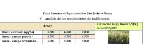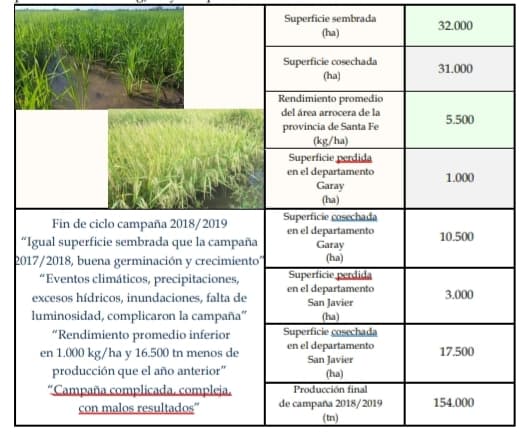 A las condiciones y consecuencias mencionadas durante todo el desarrollo del cultivo, se sumaron: los bajos precios internacionales U$S 170/tn de arroz con cáscara, más el impuesto distorsivo de $ 4/U$S exportado. La escasa a nula variación del precio a nivel local de $ 7,00/kg – $ 7,50/kg, el gran problema y las dificultades en la logística del acarreo del grano a las plantas de secado, acondicionamiento y el traslado del cereal a los molinos, por el paso restringido en el corte de la ruta provincial Nº 1. Todo lo enunciado conformó un panorama muy pesimista en el sector por falta de rentabilidad y la posible reducción del área en la campaña 2019/2020. De no producirse cambios sustanciales, a los productores que no estarían integrados a la industria, les resultaría muy difícil la subsistencia.