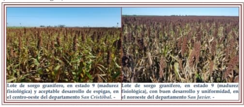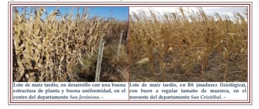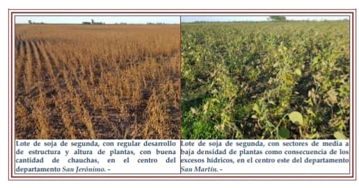 Los cultivares con destino a grano comercial, continuaron su desarrollo y crecimiento normalmente, con muy buena a excesiva disponibilidad de agua útil en los perfiles de los suelos, sin inconvenientes y con un estado sanitario de bueno a muy bueno, hasta la fecha. En los departamentos del sur del área, San Martín y San Jerónimo se detuvo el proceso de cosecha, que muy lentamente había comenzado, como consecuencia de los altos porcentajes de humedad ambiente y de grano. Se observó un amplio rango de estados fenológicos de los cultivares que fueron desde V “estados vegetativos”, muy pocos lotes, el resto en R “estados reproductivos” R2 (cuaje, ampolla), R3 (grano lechoso), R4 (grano pastoso), R5 (grano dentado) y R6 (madurez fisiológica).