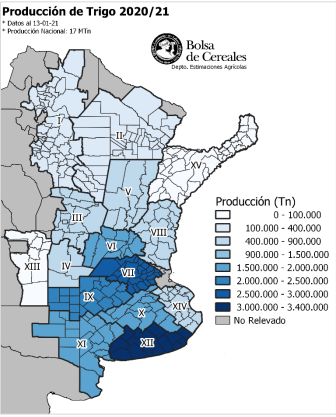 En paralelo, al sur del área agrícola la campaña se desarrolló más favorablemente, compensando parte de las pérdidas del norte y evitando una caída más abrupta de la producción nacional. En comparación al ciclo 2019/20, significativamente afectado por falta de lluvias, en el Norte de La Pampa-Oeste de Buenos Aires, el Centro de Buenos Aires y el Sudoeste de Buenos AiresSur de La Pampa, se alcanzaron rindes superiores al de la campaña previa en un 30, 41 y 95 % respectivamente. En cuanto al volumen de producción alcanzado, aunque en los tres casos fueron significativamente superiores, cabe destacar que el del sudoeste bonaerense más que duplicó el volumen regional 2019/20 (Producción 2020/21: 1.559.665 Tn vs. Producción: 2019/20: 664.463 Tn). Por otro lado, en el Sudeste de Buenos Aires, aunque el rinde promedio fue solo un 11,4 % superior al del ciclo previo, los máximos alcanzados en algunos sectores superaron los 80qq/ha, y el volumen de producción fue un 24,4 % superior al del año pasado.