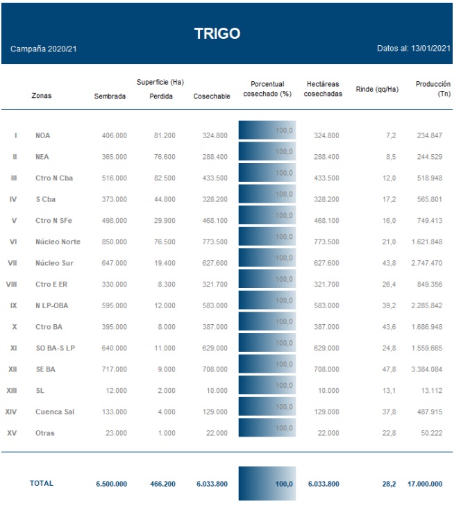 Al presente informe se ha registrado la recolección de los últimos lotes del sur del área agrícola, completando la cosecha del cereal para la campaña en curso. El rendimiento promedio nacional de 28,2 qq/ha, se ubica como el segundo más bajo de los últimos 10 años. Las pérdidas de área fueron del 7,2 % y representan la proporción más alta en el mismo período de tiempo. Sin embargo, la producción alcanzada de 17 MTn, se ubica 15,6 % por encima del promedio de la última década.