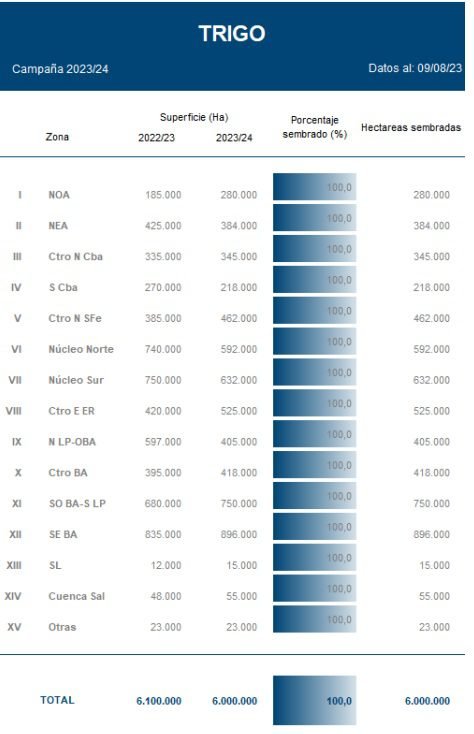 Tras un progreso intersemanal de 1,5 puntos porcentuales, finaliza la siembra de las 6 MHa estimadas para el ciclo 2023/24.