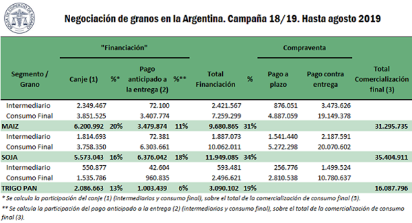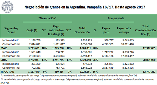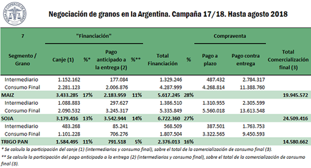 Sumando el volumen de contratos con pago anticipado a la entrega y los contratos de canje, se estima que el 34 % de la soja comercializada fue destinada a la financiación directa del productor. Este valor fue 31 % para el maíz y 19 % para el trigo.