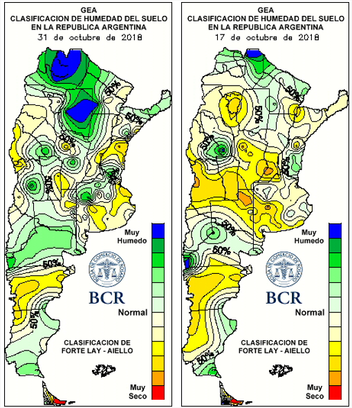 Hay un antes y después de los últimos quince días de octubre. Y esta mejora ha ido acentuándose aún más con la acción de las lluvias de las últimas 48 horas. Al observar el estado de la condición hídrica de los suelos de Argentina entre el 17 de octubre y hoy, 31, la recuperación es sorprendente: Jujuy, Salta, Santiago del Estero y Chaco muestran un cambio contundente.