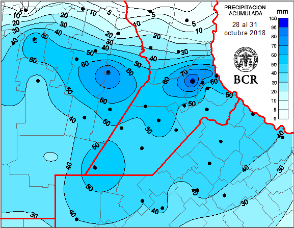 El sur de Santa Fe tambien hizo diferencia. Una amplia franja que se extiende por debajo y encima de Rosario, donde se agudizaba hasta hace unos días el problema de mayor deficiencia hídrica, recibió desde el lunes 29 más de 50 mm. Pujato, a tan solo 50 km, acumuló en 48 horas 95,8 mm. Rosario le sigue con 66,6 mm, Zavalla con 66 mm y Rufino con 60,8 mm.