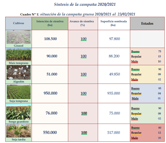 En etapas de floración, comienzo de fructificación y fructificación un 95 % de los cultivares de soja temprana presentaron estado bueno a muy bueno, con lotes excelentes, como consecuencia de los cambios de las condiciones climáticas desde la segunda quincena de enero de 2021 hasta la fecha, que fueron muy favorables, un 4 % regular y un 1 % malo, estos últimos se observaron en suelos con limitantes y menor aptitud agrícola, con lotes que presentaron cierto marchitamiento por altas temperaturas y no uniformes, manchonados.