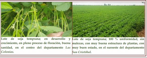 Dada la óptima disponibilidad de agua útil en los perfiles de los suelos, en un muy alto porcentaje mostraron estados bueno a muy buenos, con lotes excelentes, evidenciando buenas estructuras de plantas, floración y cantidad de vainas, indicadores que reflejaron, hasta la fecha, todo el potencial genético de las semillas utilizadas.