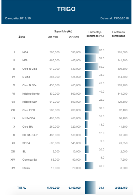 En contraposición, sobre las regiones del centro y sur agrícola, la implantación progresa a buen ritmo bajo una condición hídrica que oscila entre adecuada y óptima, aunque algunas localidades puntuales presentan leves excesos hídricos. Los mayores progresos se relevaron sobre las regiones Centro-Norte de Córdoba y Santa Fe, Núcleos Norte y Sur, Centro-Este de Entre Ríos y Norte de La Pampa-Oeste de Buenos Aires. A su vez, en el sur de Buenos Aires y La Pampa la siembra cubrió entre 9 % y 12 % del área proyectada.