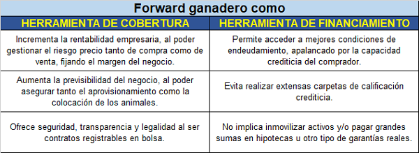 Como herramienta financiera, el mayor valor de un forward reside en la posibilidad de endosarlo y ceder su derecho de cobro a otro actor de la cadena, como un vendedor de insumos, un consignatario de hacienda o incluso a una entidad financiera o fondo de inversión que desee capturar tasas vinculadas a la evolución del sector.
