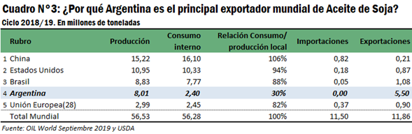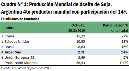 El aceite de soja es el segundo aceite vegetal más relevante en el mundo, sólo por detrás del aceite de palma. Argentina cumple un rol estratégico en este mercado, aportando más de 8 millones de toneladas de aceite. Este volumen representa el 14% de la producción global, que según datos de Oil World, en 2018/19 totalizó 56,53 Mt. La República Popular China es líder en originación y consumo de aceite de soja, con una producción de más de 15Mt, aporta el 27% del producto. En segundo lugar se ubica la industria sojera de Estados Unidos que con casi 11 Mt representa el 19% del producto, y en tercer lugar se encuentra Brasil con una producción de 8,83 Mt que hacen al 16% del producto global.