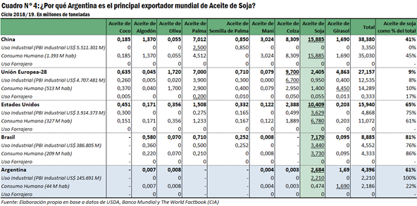 China, Estados Unidos, Brasil y la Unión Europea, que conforman junto a Argentina el top 5 de productores de aceite de soja, tienen un alto consumo interno de aceite de soja. En contraste con el bajo consumo interno de Argentina, cuyo mercado doméstico absorbe sólo el 30% de la producción, China, Estados Unidos, Brasil y la Unión Europea asignan más del 80% de su producción al mercado doméstico.
