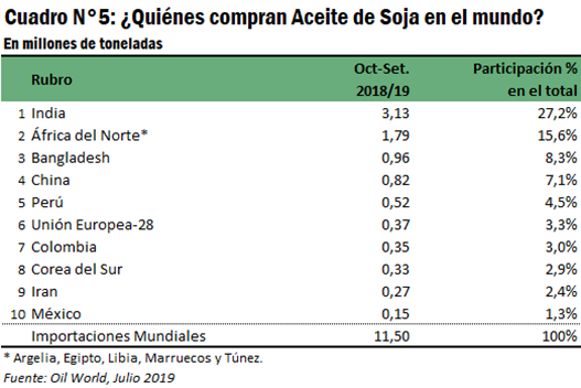 India, que es el tercer consumidor mundial de aceites vegetales, es el principal importador de aceite de soja. En el ciclo 2018/19, el segundo país más poblado del mundo adquirió 3,1 Mt del aceite, de destina en su totalidad al consumo humano. La demanda externa de India creció un 3% en respecto del ciclo anterior y las compras actuales representan casi un 30% de las compras totales del aceite.