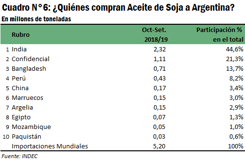 Además de India, otros destinos de exportación para Argentina que entran en el top 10 de importadores mundiales de aceite de soja son: Bangladesh (713.000 tn), Perú (430.000 tn), China (174.000 tn), Marruecos (154.000 tn), Argelia (150.000 tn) y Egipto (65.000 tn). Por otro lado, el volumen de despachos con destino confidencial es muy alto en el caso del aceite de soja alcanzando 1,11 Mt en el ciclo 2018/19, y representando el 21% del total exportado.