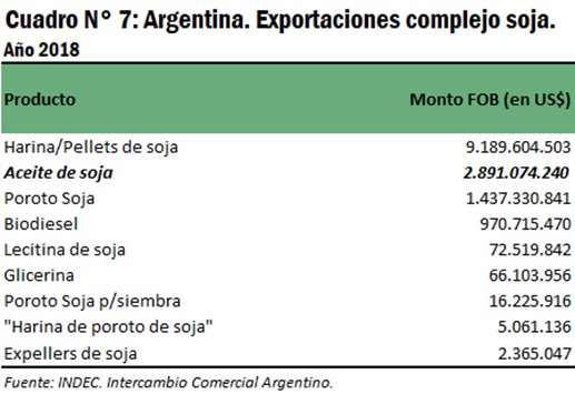 En el año 2018, los despachos del complejo soja en Argentina (U$S 14.600 millones) representaron casi un cuarto del valor total exportado por el país, que superó los 61.500 millones de dólares. Es decir, que uno de cada cuatro dólares provenientes de las exportaciones de bienes, corresponde a algún producto de la industria de la oleaginosa.