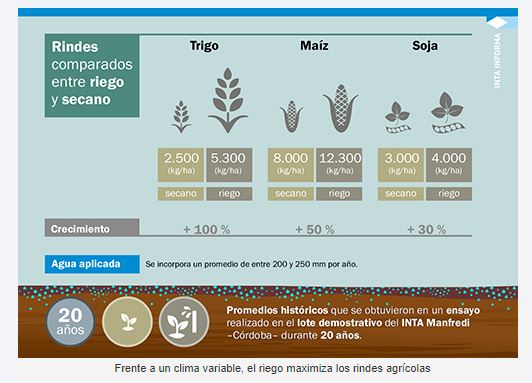 Basado en más de dos décadas de registro, un ensayo del INTA Manfredi demuestra que tanto el trigo como el maíz y la soja bajo riego aumentan los rendimientos en un 100, 50 y 30 %, respectivamente, en relación con los obtenidos en secano con manejo adecuado. Por las condiciones agroambientales en que se obtuvieron, estos resultados pueden considerarse como indicativos de un amplio radio: zonas de San Luis, Santiago del Estero, Tucumán, Santa Fe, norte de Buenos Aires y norte de La Pampa.