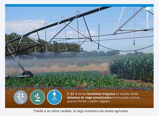Hoy la Argentina tiene 2 M de hectáreas bajo riego y, con tecnología y manejo eficiente, podría triplicar esa superficie. Especialistas del INTA analizan posibilidades de expansión en el país, costos y desempeño de los distintos sistemas en un contexto climático complejo.