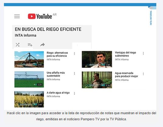 Para contribuir a este objetivo, desde el instituto se realizan trabajos con productores y en parcelas demostrativas, desde riego por goteo con productores familiares hasta cultivos de gran escala a través del sistema Chacras junto con Aapresid. Estos proyectos permiten evaluar el desempeño de los distintos sistemas de riego y las necesidades hídricas de los cultivos a lo largo del ciclo de desarrollo.