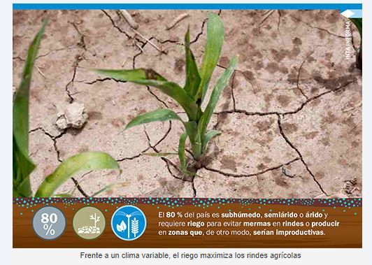 El 20 % de la Argentina, comprendido por el área mesopotámica –sobre todo–, es húmeda y concentra el 82 % de los recursos hídricos superficiales. El 80 % restante es subhúmeda, semiárida o árida y, por lo tanto, requiere la aplicación de riego para producir o evitar mermas en el rendimiento de los cultivos.