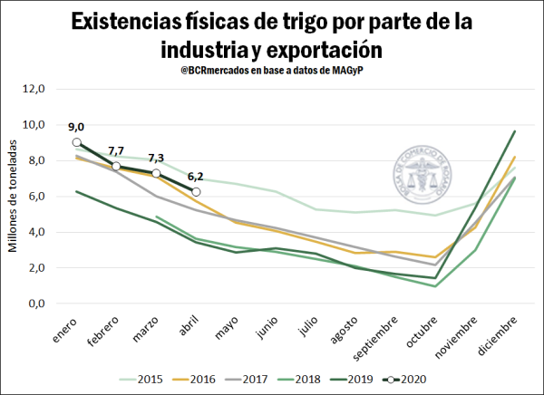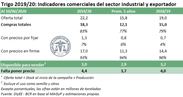La campaña de trigo 2019/20 ya ha dejado atrás los momentos más álgidos de su comercialización con altos volúmenes de exportación, concentrados principalmente entre diciembre y marzo. Según los datos provistos por el Ministerio de Agricultura, Ganadería y Pesca (MAGyP), el mercado exportador y molinero ya ha adquirido 18,3 Mt lo cual representa el 83% de la oferta total para la actual campaña. De esta forma, se ubica 4% por encima de lo obtenido en el ciclo 2018/19 y 7% por delante del promedio de los últimos 5 años. En términos absolutos las diferencias se acrecientan, ya que el total producido en la última cosecha se ha ubicado en records históricos permitiendo una gran oferta disponible con destino al mercado externo y el procesamiento local. No obstante, aún restan por vender 3 Mt estando solamente 100.000 tn por encima del promedio de las últimas cinco 5 campañas.