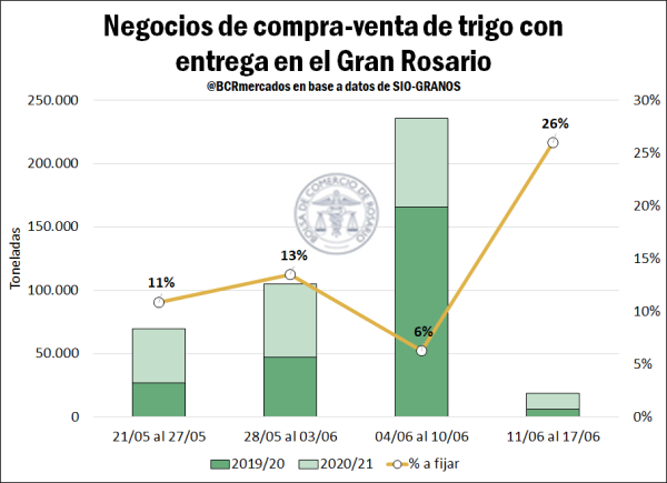 En relación a la evolución de la comercialización del cereal en el mercado local. Si bien ya nos encontramos bien avanzados en actual campaña comercial, destacó el bajo volumen de negocios concertados con destino al Gran Rosario en la semana que finalizó el 17 de junio de la mano de la pausa en los precios.
