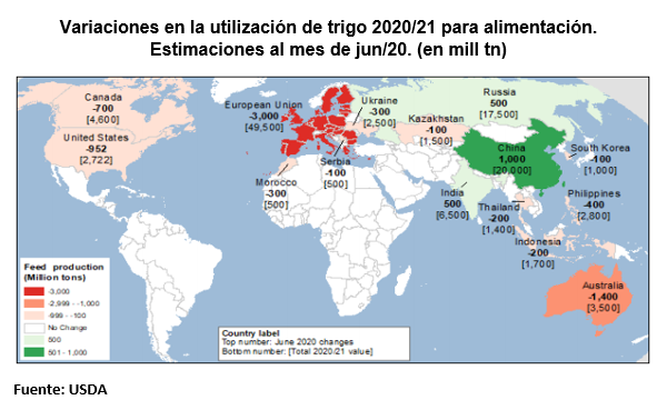 En este sentido, existen varios factores que contribuyen a dicha tendencia en la alimentación a base de trigo en el ciclo 2020/21. Por un lado, el record esperado en la oferta mundial de maíz probablemente sea el factor que mayor presión ejerza en este momento. A nivel regional, se espera que el mayor uso de cebada en las raciones de alimentación también reduzca la demanda del trigo. En Australia, actualmente se establecieron nuevas restricciones que limitan las posibilidades de exportación de la cosecha de cebada, lo cual tiene repercusiones en una mayor cantidad de cebada disponible para la alimentación nacional, compensando así la demanda de trigo forrajero. Por último, en la región de la Unión Europea también se aguarda un incremento en el uso de cebada para alimentación como sustituto del trigo, respectivamente.